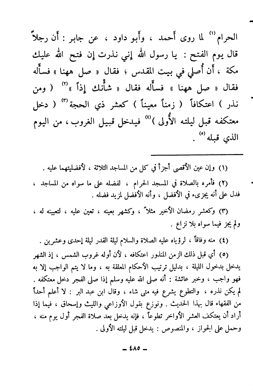 الحرام (¬1) لما روى أحمد، وأبو داود، عن جابر: أن رجلاً قال يوم الفتح: يا رسول الله إني نذرت إن فتح الله عليك مكة، أَن أُصلي في بيت المقدس؛ فقال «صل ههنا» فسأله فقال «صل ههنا» فسأله فقال «شأْنك إذًا» (¬2) (ومن نذر) اعتكافًا (زمنًا معينًا) كعشر ذي الحجة (¬3) (دخل معتكفه قبل ليلته الأُولى) (¬4) فيدخل قبيل الغروب، من اليوم الذي قبله (¬5) .