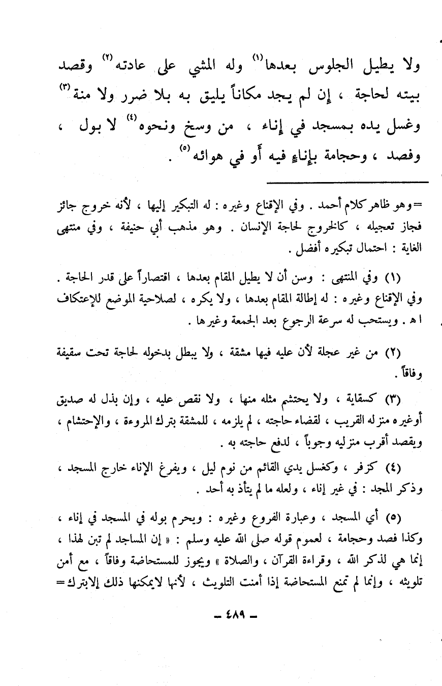 (¬5) أي المسجد، وعبارة الفروع وغيره: ويحرم بوله في المسجد في إناء، وكذا فصد وحجامة، لعموم قول صلى الله عليه وسلم: «إن المساجد لم تبن لهذا، إنما هي لذكر الله، وقراءة القرآن، والصلاة» ويجوز للمستحاضة وفاقًا، مع أمن تلويثه، وإنما لم تمنع المستحاضة إذا أمنت التلويث، لأنها لا يمكنها ذلك إلا بترك