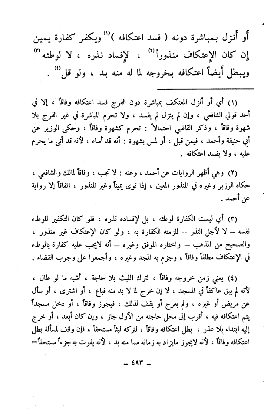 (¬4) يعني زمن خروجه وفاقًا، لترك اللبث بلا حاجة، أشبه ما لو طال، لأنه لم يبق عاكفًا في المسجد، لا إن خرج لما لا بد منه فباع، أو اشترى، أو سأل عن مريض أو غيره، ولم يعرج أو يقف لذلك، فيجوز وفاقًا، أو دخل مسجدًا يتم اعتكافه فيه، أقرب إلى محل حاجته من الأول جاز، وإن كان أبعد، أو خرج إليه ابتداء بلا عذر، بطل اعتكافه وفاقًا، لتركه لبثًا مستحقًا، فإن وقف لمسألة بطل اعتكافه وفاقًا، لأنه لا يجوز ما يزاد به زمانه مما منه بد، لأنه يفوت به جزءًا مستحقًا
