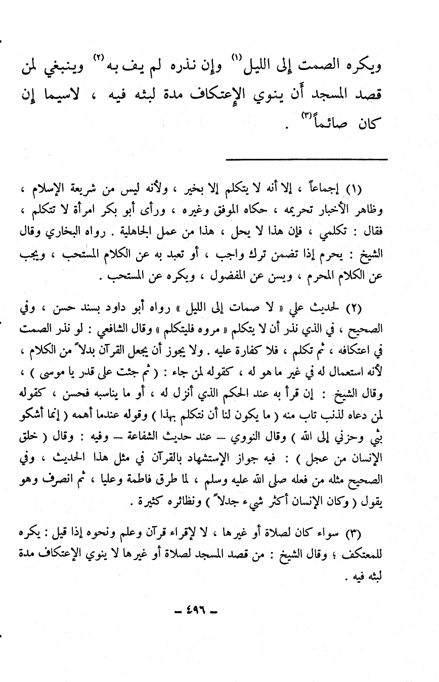 (¬2) لحديث علي «لا صمات إلى الليل» رواه أبو داود بسند حسن، وفي الصحيح، في الذي نذر أن لا يتكلم «مروه فليتكلم» وقال الشافعي: لو نذر الصمت في اعتكافه، ثم تكلم، فلا كفارة عليه. ولا يجوز أن يجعل القرآن بدلاً من الكلام، لأنه استعمال له في غير ما هو له، كقوله لمن جاء: {ثُمَّ جِئْتَ عَلَى قَدَرٍ يَا مُوسَى} ، وقال الشيخ: إن قرأ به عند الحكم الذي أنزل له، أو ما يناسبه فحسن، كقوله لمن دعاه لذنب تاب منه (ما يكون لنا أن نتكلم بهذا) وقوله عندما أهمه {إِنَّمَا أَشْكُو بَثِّي وَحُزْنِي إِلَى اللهِ} وقال النووي – عند حديث الشفاعة – وفيه: وقال {خُلِقَ الإِنْسَانُ مِنْ عَجَلٍ} : فيه جواز الاستشهاد بالقرآن في مثل هذا الحديث، وفي الصحيح مثله من فعله صلى الله عليه وسلم، لما طرق فاطمة وعليا، ثم انصرف وهو يقول {وَكَانَ الإِنْسَانُ أَكْثَرَ شَيْءٍ جَدَلاً} ونظائره كثيرة.