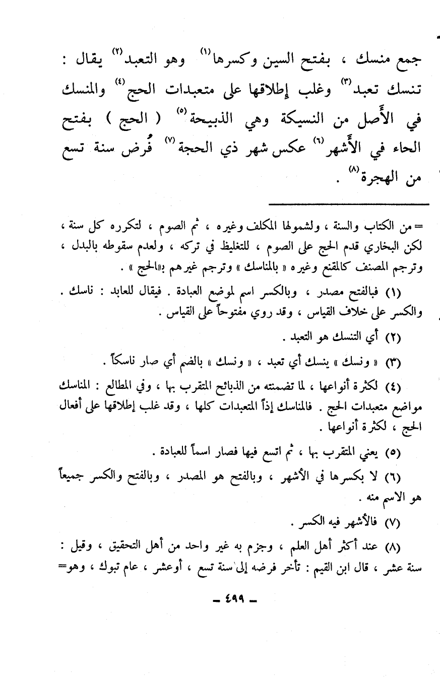 جمع منسك، بفتح السين وكسرها (¬1) وهو التعبد (¬2) يقال: تنسك تعبد (¬3) وغلب إطلاقها على متعبدات الحج (¬4) والمنسك في الأَصل من النسيكة وهي الذبيحة (¬5) (الحج) بفتح الحاء في الأشهر (¬6) عكس شهر ذي الحجة (¬7) فُرض سنة تسع من الهجرة (¬8) .