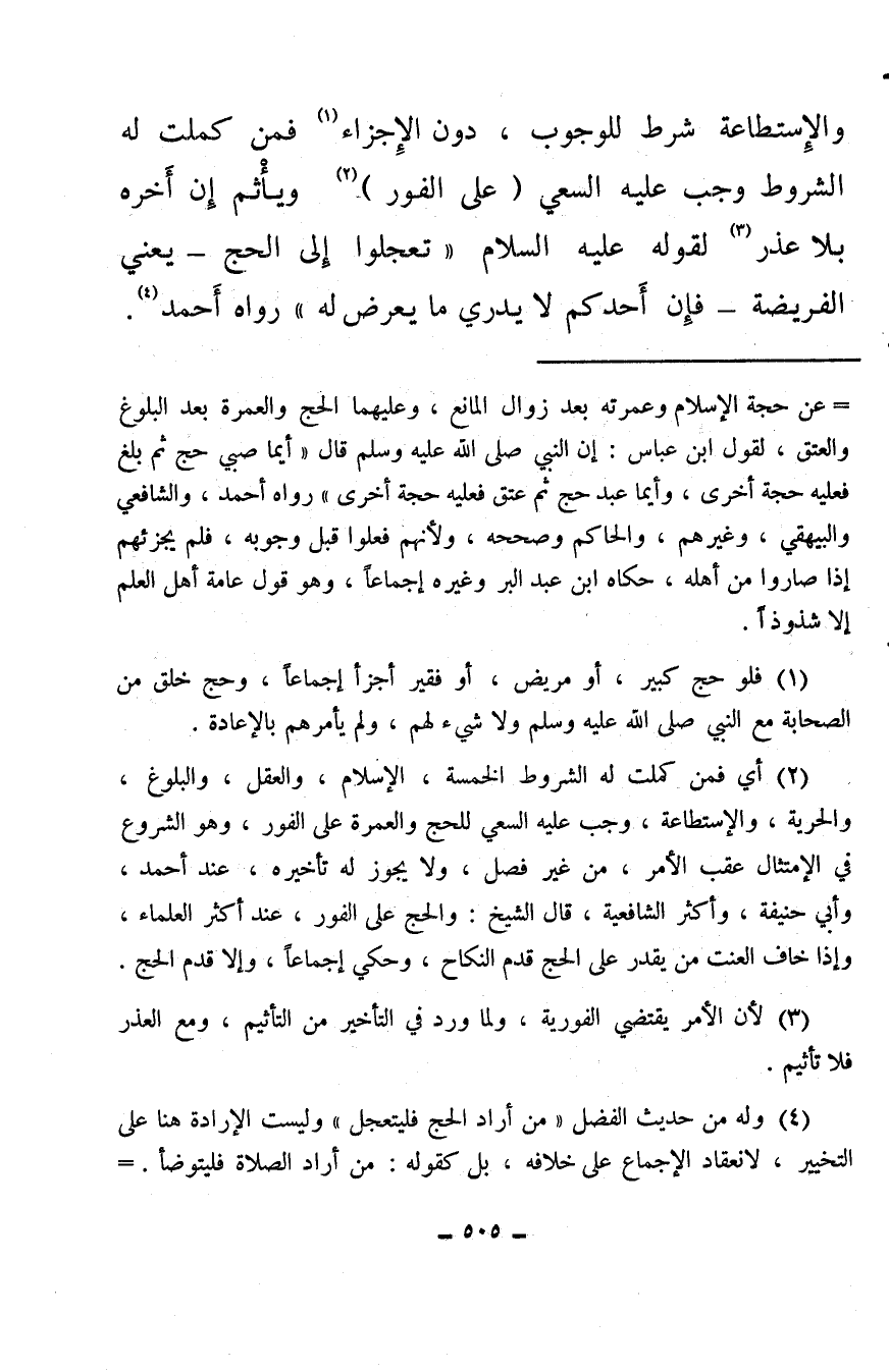 والاستطاعة شرط للوجوب، دون الإجزاء (¬1) فمن كملت له الشروط وجب عليه السعي (على الفور) (¬2) ويأْثم إن أخره بلا عذر (¬3) لقوله عليه السلام «تعجلوا إلى الحج – يعني الفريضة – فإن أَحدكم لا يدري ما يعرض له» رواه أحمد (¬4) .