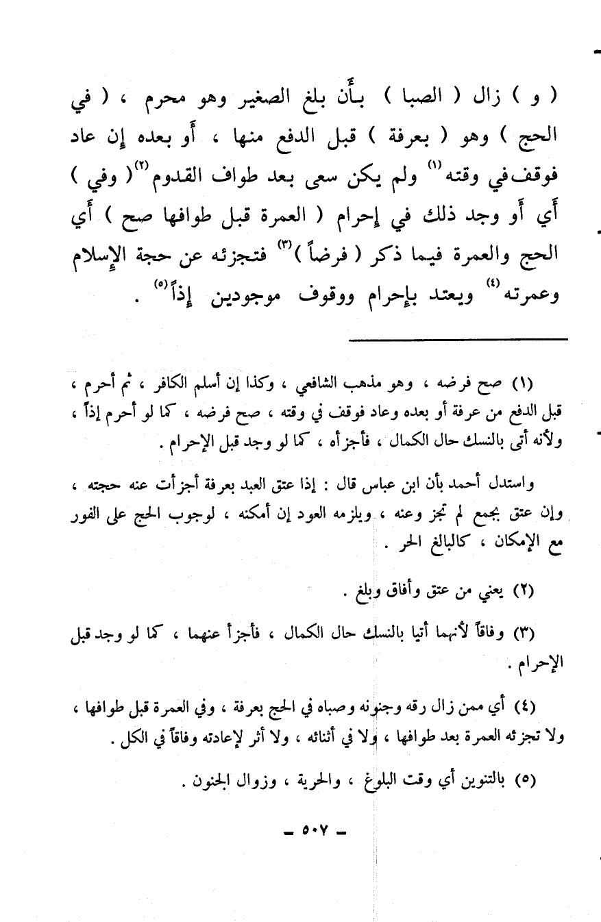 (¬4) أي ممن زال رقه وجنونه وصباه في الحج بعرفة، وفي العمرة قبل طوافها، ولا تجزئه العمرة بعد طوافها، ولا في أثنائه، ولا أثر لإعادته وفاقًا في الكل.