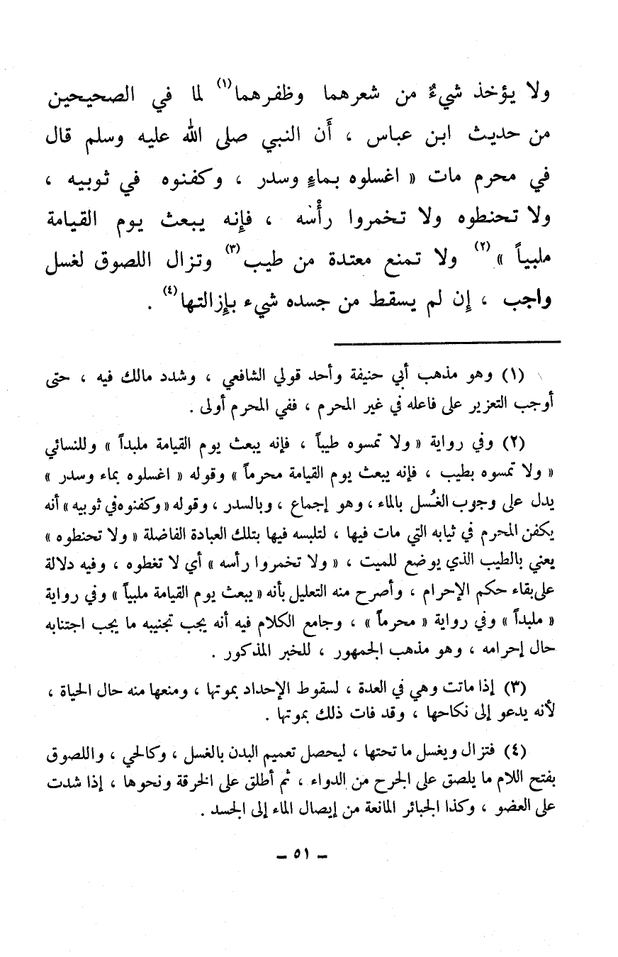 (¬2) وفي رواية «ولا تمسوه طيبًا، فإنه يبعث يوم القيامة ملبدًا» وللنسائي «ولا تمسوه بطيب، فإنه يبعث يوم القيامة محرمًا» وقوله «اغسلوه بماء وسدر» يدل على وجوب الغُسل بالماء، وهو إجماع، وبالسدر، وقوله «وكفنوه في ثوبيه» أنه يكفن المحرم في ثيابه التي مات فيها، لتلبسه فيها بتلك العبادة الفاضلة، «ولا تحنطوه» يعني بالطيب الذي يوضع للميت، «ولا تخمروا رأسه» أي لا تغطوه، وفيه دلالة على بقاء حكم الإحرام، وأصرح منه التعليل بأنه «يبعث يوم القيامة ملبيًا» وفي رواية «ملبدًا» وفي رواية «محرمًا» ، وجامع الكلام فيه أنه يجب تجنيبه ما يجب اجتنابه حال إحرامه، وهو مذهب الجمهور، للخبر المذكور.