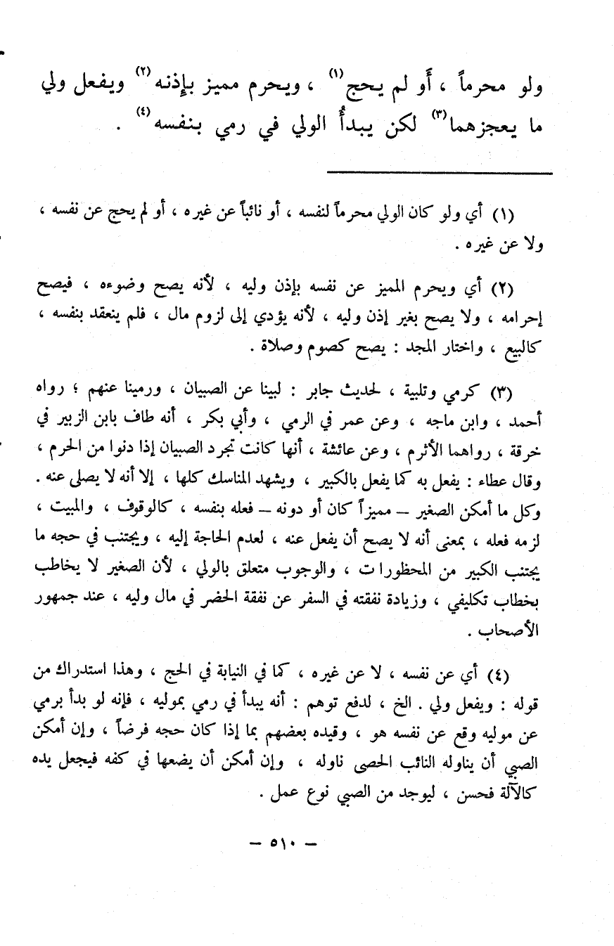 (¬3) كرمي وتلبية، لحديث جابر: لبينا عن الصبيان، ورمينا عنهم؛ رواه أحمد، وابن ماجه، وعن عمر في الرمي، وأبي بكر، أنه طاف بابن الزبير في خرقة، رواهما الأثرم، وعن عائشة، أنها كانت تجرد الصبيان إذا دنوا من الحرم، وقال عطاء: يفعل به كما يفعل بالكبير، ويشهد المناسك كلها، إلا أنه لا يصلي عنه، وكل ما أمكن الصغير – مميزًا كان أو دونه – فعله بنفسه، كالوقوف، والمبيت، لزمه فعله، بمعنى أنه لا يصح أن يفعل عنه، لعدم الحاجة إليه، ويجتنب في حجة ما يجتنب الكبير من المحظورات، والوجوب متعلق بالولي، لأن الصغير لا يخاطب بخطاب تكليفي، وزيادة نفقته في السفر عن نفقة الحضر في مال وليه، عند جمهور الأصحاب.