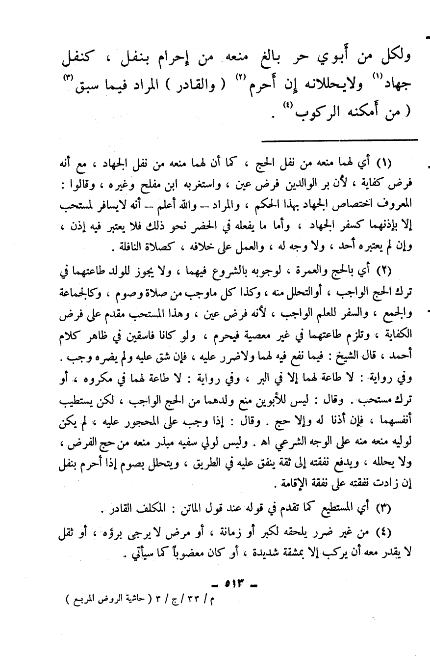 (¬1) أي لهما منعه من نفل الحج، كما أن لهما منعه من نفل الجهاد، مع أنه فرض كفاية، لأن بر الوالدين فرض عين، واستغربه ابن مفلح وغيره، وقالوا: المعروف اختصاص الجهاد بهذا الحكم، والمراد – والله أعلم – أنه لا يسافر لمستحب إلا بإذنهما كسفر الجهاد، وأما ما يفعله في الحضر نحو ذلك فلا يعتبر فيه إذن، وإن لم يعتبره أحد، ولا وجه له، والعمل على خلافه، كصلاة النافلة.