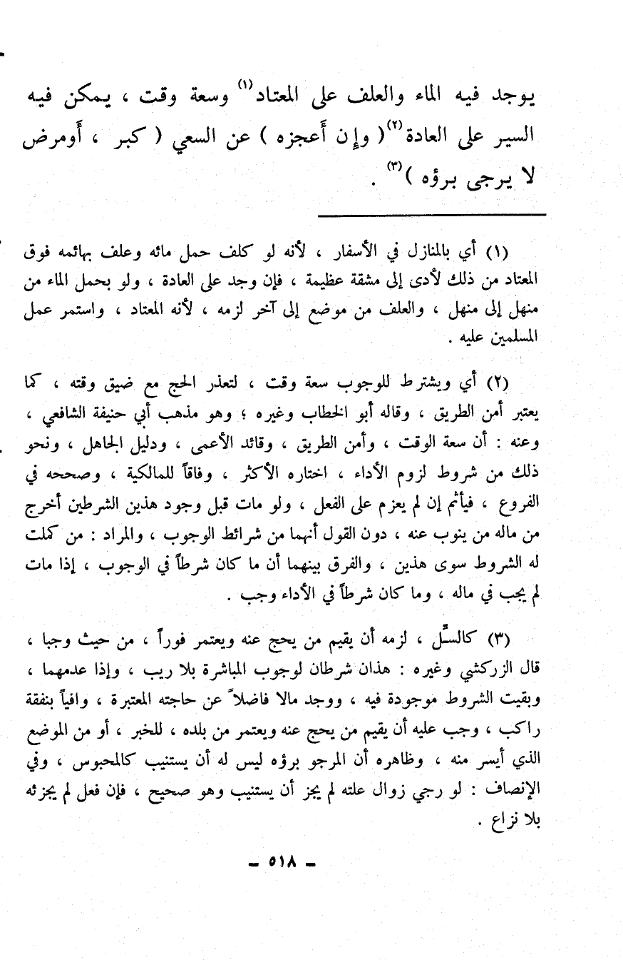 (¬1) أي بالمنازل في الأسفار، لأنه لو كلف حمل مائه وعلف بهائمه فوق المعتاد من ذلك لأدى إلى مشقة عظيمة، فإن وجد على العادة، ولو بحمل الماء من منهل إلى منهل، والعلف من موضع إلا آخر لزمه، لأنه المعتاد، واستمر عمل المسلمين عليه.