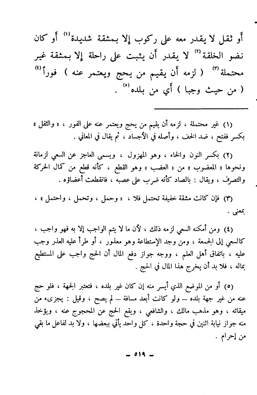 (¬4) ومن أمكنه السعي لزمه ذلك، لأن ما لا يتم الواجب إلا به فهو واجب، كالسعي إلى الجمعة، ومن وجد الاستطاعة وهو معذور، أو طرأ عليه العذر وجب عليه، باتفاق أهل العلم، ووجه جواز دفع المال أن الحج واجب على المستطيع بماله، فلا بد أن يخرج هذا المال في الحج.