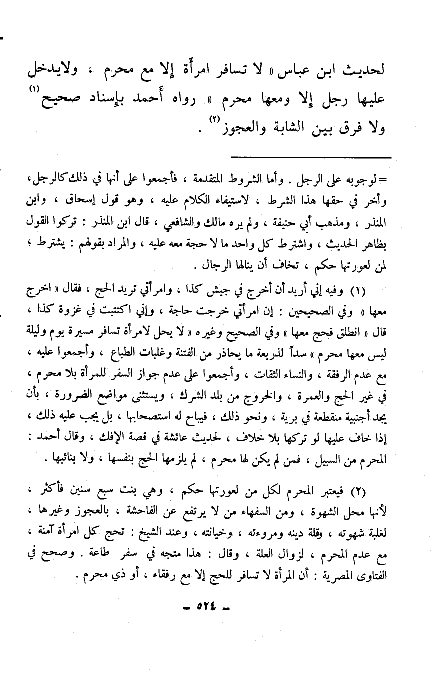 (¬1) وفيه إني أريد أن أخرج في جيش كذا، وامرأتي تريد الحج، فقال «اخرج معها» وفي الصحيحين: إن امرأتي خرجت حاجة، وإني اكتتبت في غزوة كذا، قال «انطلق فحج معها» وفي الصحيح وغيره «لا يحل لامرأة تسافر مسيرة يوم وليلة ليس معها محرم» سدًا لذريعة ما يحاذر من الفتنة وغلبات الطباع، وأجمعوا عليه، مع عدم الرفقة، والنساء الثقات، وأجمعوا على عدم جواز السفر للمرأة بلا محرم، في غير الحج والعمرة، والخروج من بلد الشرك، ويستثنى مواضع الضرورة، بأن يجد أجنبية منقطعة في برية، ونحو ذلك، فيباح له استصحابها، بل يجب عليه ذلك، إذا خاف عليها لو تركها بلا خلاف، لحديث عائشة في قصة الإفك، وقال أحمد: المحرم من السبيل، فمن لم يكن لها محرم، لم يلزمها الحج بنفسها، ولا بنائبها.