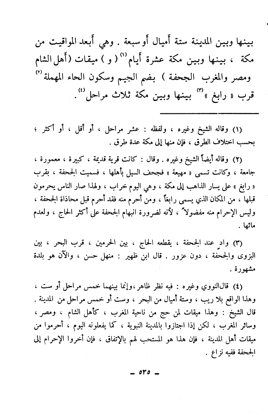 (¬4) قال النووي وغيره: فيه نظر ظاهر، وإنما بينهما خمس مراحل أو ست، وهذا الواقع بلا ريب، وستة أميال من البحر، وست أو خمس مراحل من المدينة. قال الشيخ: وهذا ميقات لمن حج من ناحية المغرب، كأهل الشام، ومصر، وسائر المغرب، لكن إذا اجتازوا بالمدينة النبوية، كما يفعلونه اليوم، أحرموا من ميقات أهل المدينة، فإن هذا هو المستحب لهما بالاتفاق، فإن أخروا الإحرام إلى الجحفة ففيه نزاع.
