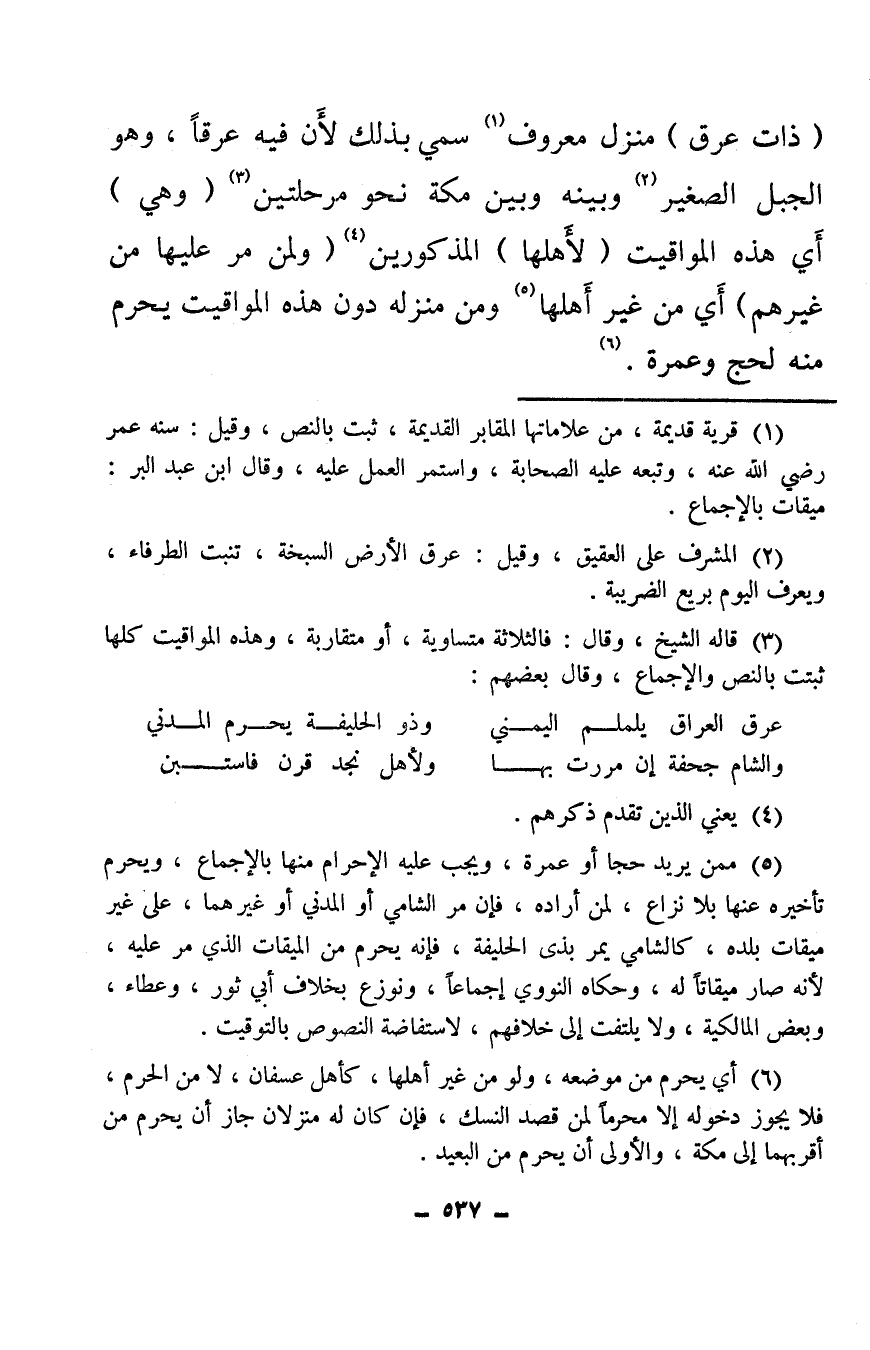 (¬5) ممن يريد حجًا أو عمرة، ويجب عليه الإحرام منها بالإجماع، ويحرم تأخيره عنها بلا نزاع، لمن أراده، فإن مر الشامي أو المدني أو غيرهما، على غير ميقات بلده، كالشامي يمر بذي الحليفة، فإنه يحرم من الميقات الذي مر عليه، لأنه صار ميقاتًا له، وحكاه النووي إجماعًا، ونوزع بخلاف أبي ثور، وعطاء، وبعض المالكية، ولا يلتفت إلى خلافهم، لاستفاضة النصوص بالتوقيت.
