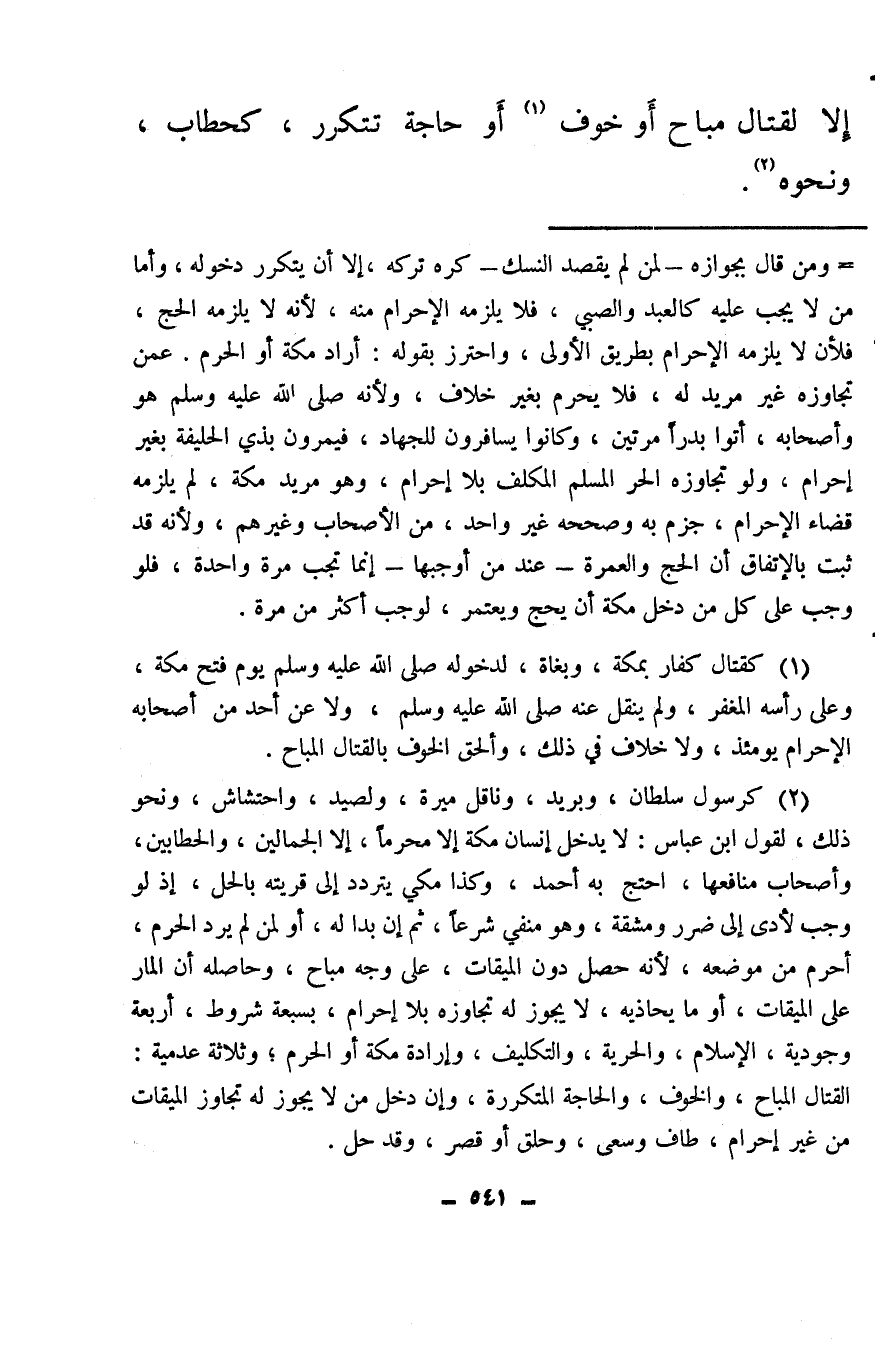 (¬1) كقتال كفار بمكة، وبغاة، لدخوله صلى الله عليه وسلم يوم فتح مكة، وعلى رأسه المغفر، ولم ينقل عنه صلى الله عليه وسلم، ولا عن أحد من أصحابه الإحرام يومئذ، ولا خلاف في ذلك، وألحق الخوف بالقتال المباح.