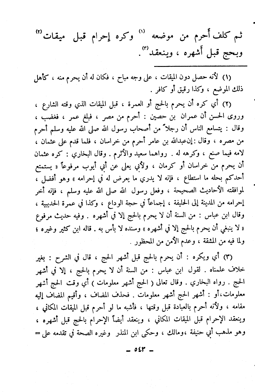 (¬2) أي كره أن يحرم بالحج أو العمرة، قبل الميقات الذي وقته الشارع، وروى الحسن أن عمران بن حصين: أحرم من مصر، فبلغ عمر، فغضب، وقال: يتسامع الناس أن رجلاً من أصحاب رسول الله صلى الله عليه وسلم أحرم من مصره، وقال: إن عبد الله بن عامر أحرم من خراسان، فلما قدم على عثمان، لامه فيما صنع، وكرهه له. رواهما سعيد والأثرم. وقال البخاري: كره عثمان أن يحرم من خراسان أو كرمان، ولأبي يعلى عن أبي أيوب مرفوعًا «يستمتع أحدكم بحله ما استطاع، فإنه لا يدري ما يعرض له في إحرامه» وهو أفضل، لموافقته الأحاديث الصحيحة، وفعل رسول الله صلى الله عليه وسلم، فإنه أخر إحرامه من المدينة إلى الحليفة، إجماعًا في حجة الوداع، وكذا في عمرة الحديبية، وقال ابن عباس: من السنة أن لا يحرم بالحج إلا في أشهره. وفيه حديث مرفوع «لا ينبغي أن يحرم بالحج إلا في أشهره» وسنده لا بأس به. قاله ابن كثير وغيره؛ ولما فيه من المشقة، وعدم الأمن من المحظور.