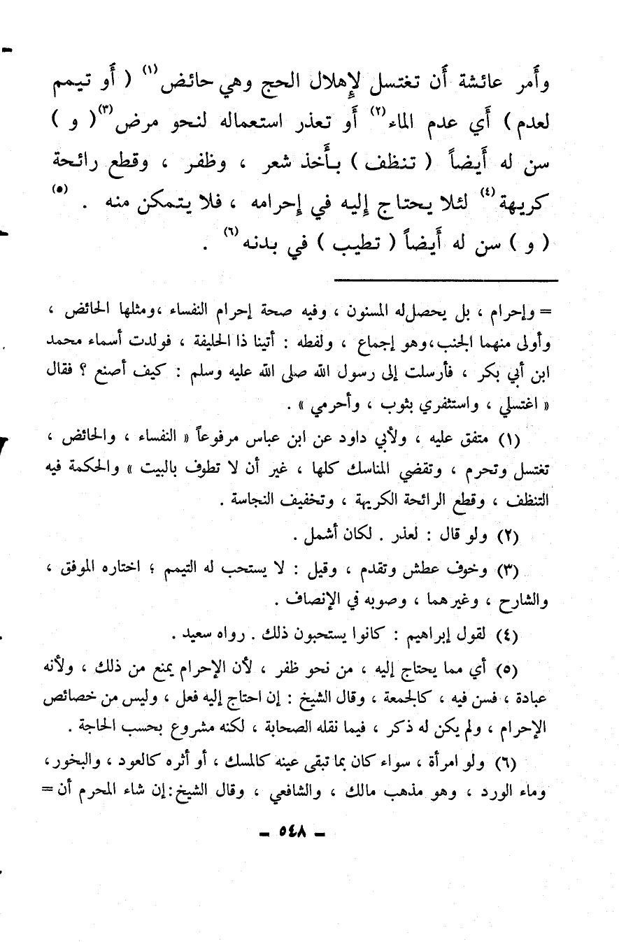 (¬1) متفق عليه، ولأبي داود عن ابن عباس مرفوعًا «النفساء، والحائض، تغتسل وتحرم، وتقضي المناسك كلها، غير أن لا تطوف بالبيت» والحكمة فيه التنظف، وقطع الرائحة الكريهة، وتخفيف النجاسة.