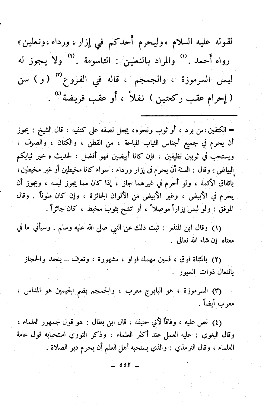 لقوله عليه اسلام «وليحرم أحدكم في إزار، ورداء، ونعلين» رواه أحمد (¬1) . والمراد بالنعلين: التاسومة (¬2) . ولا يجوز له لبس السرموزة، والجمجم، قاله في الفروع (¬3) (و) سن (إحرام عقب ركعتين) نفلاً، أَو عقب فريضة (¬4) .