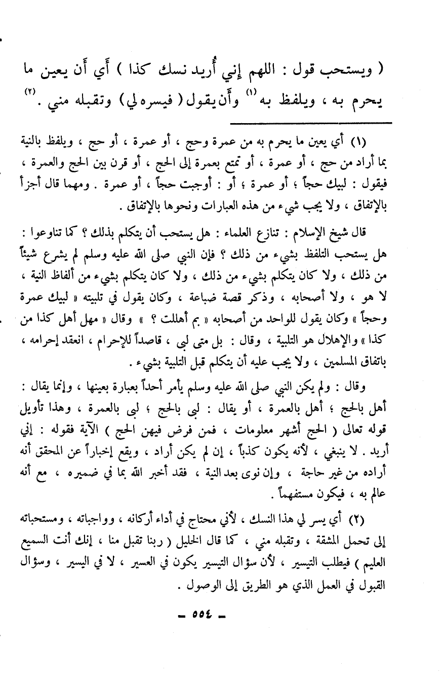 (¬2) أي يسر لي هذا النسك، لأني محتاج في أداء أركانه، وواجباته، ومستحباته إلى تحمل المشقة، وتقبله مني، كما قال الخليل {رَبَّنَا تَقَبَّلْ مِنَّا إِنَّكَ أَنْتَ السَّمِيعُ الْعَلِيمُ} فيطلب التيسير، لأن سؤال التيسير يكون في العسير، لا في اليسير، وسؤال القبول في العمل الذي هو الطريق إلى الوصول.