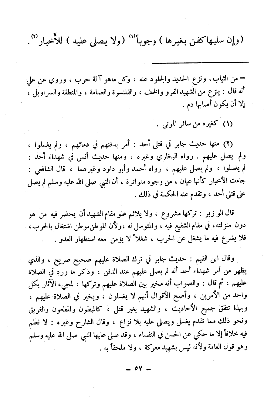 (¬2) منها حديث جابر في قتلى أحد: أمر بدفنهم في دمائهم، ولم يغسلوا، ولم يصل عليهم. رواه البخاري وغيره، ومنها حديث أنس في شهداء أحد: لم يغسلوا، ولم يصل عليهم، رواه أحمد وأبو داود وغيرهما، قال الشافعي: جاءت الأخبار كأنها عيان، من وجوه متواترة، أن النبي صلى الله عليه وسلم لم يصل على قتلى أحد، وتقدم عنه الحكمة في ذلك.
