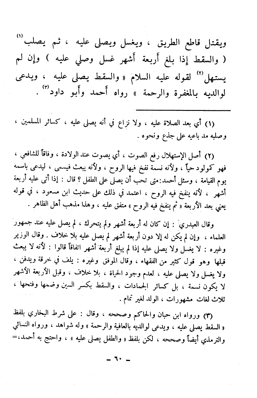 (¬2) أصل الاستهلال رفع الصوت، أي يصوت عند الولادة، وفاقًا للشافعي، فهو كمولود حيًا، ولأنه نسمة نفخ فيها الروح، ولأنه يبعث فيسمى، ليدعى باسمه يوم القيامة، وسئل أحمد: متى تحب أن يصلى على الطفل؟ قال: إذا أتى عليه أربعة أشهر، لأنه ينفخ فيه الروح، اعتمد في ذلك على حديث ابن مسعود، في قوله يعني بعد الأربعة «ثم ينفخ فيه الروح» متفق عليه، وهذا مذهب أهل الظاهر.