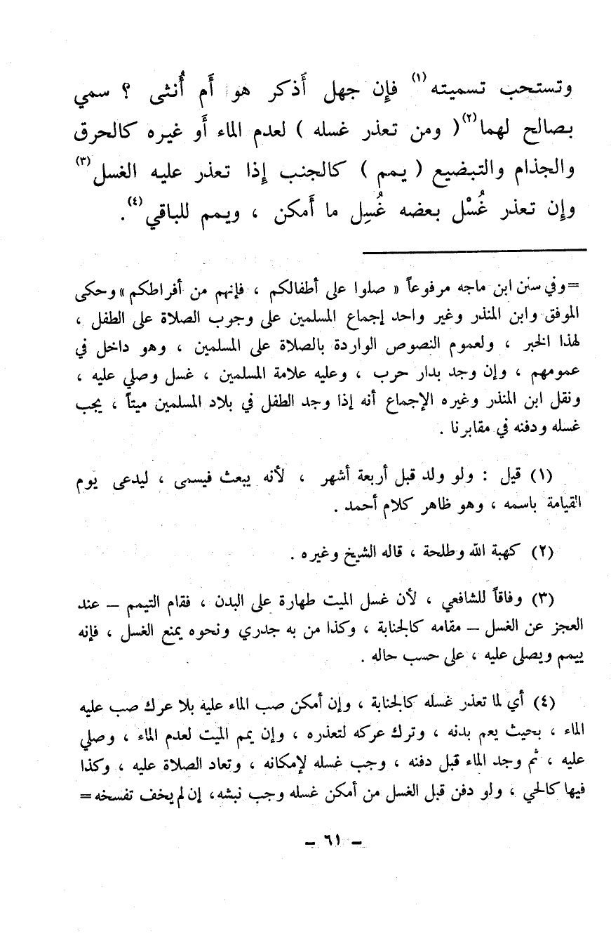 وتستحب تسميته (¬1) فإن جهل أَذكر هو أَم أُنثى؟ سمي بصالح لهما (¬2) (ومن تعذر غسله) لعدم الماء أَو غيره كالحرق والجذام والتبضيع (يمم) كالجنب إذا تعذر عليه الغسل (¬3) وإن تعذر غُسْل بعضه غُسِل ما أَمكن، ويمم للباقي (¬4) .