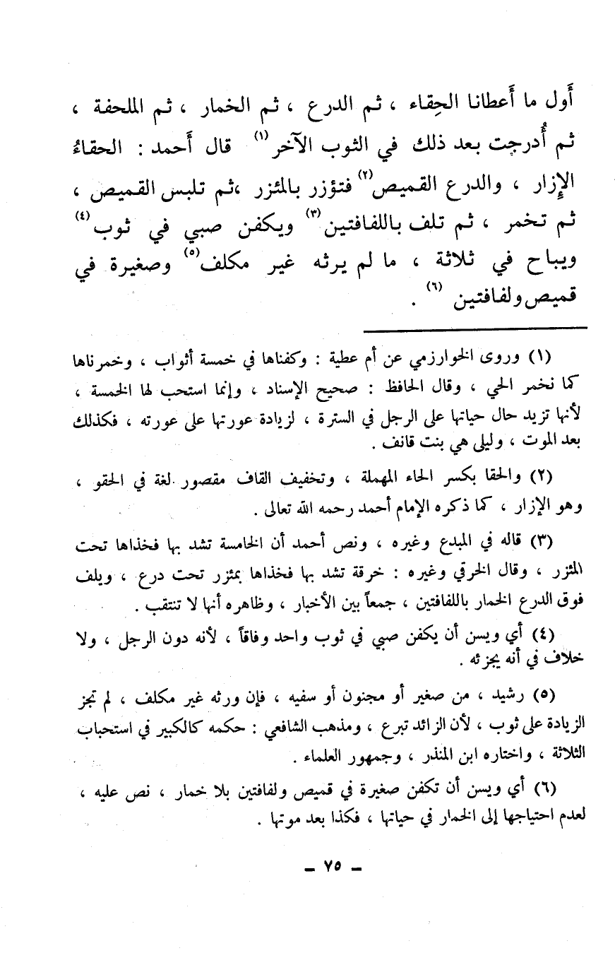 (¬1) وروى الخوارزمي عن أم عطية: وكفناها في خمسة أثواب، وخمرناها كما نخمر الحي، وقال الحافظ: صحيح الإسناد، وإنما استحب لها الخمسة، لأنها تزيد حال حياتها على الرجل في السترة، لزيادة عورتها على عورته، فكذلك بعد الموت، وليلى هي بنت قانف.