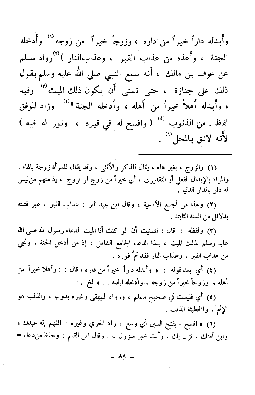 وأبدله دارًا خيرًا من داره، وزوجًا خيرًا من زوجه (¬1) وأدخله الجنة، وأعذه من عذاب القبر، وعذاب النار) (¬2) رواه مسلم عن عوف بن مالك، أنه سمع النبي - صلى الله عليه وسلم - يقول ذلك على جنازة، حتى تمنى أن يكون ذلك الميت (¬3) وفيه «وأبدله أهلاً خيرًا من أهله، وأدخله الجنة» (¬4) وزاد الموفق لفظ: من الذنوب (¬5) (وافسح له في قبره، ونور له فيه) لأَنه لائق بالمحل (¬6) .