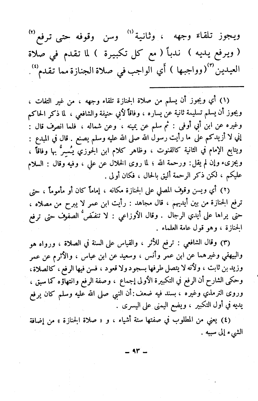 ويجوز تلقاء وجهه، وثانية (¬1) وسن وقوفه حتى ترفع (¬2) (ويرفع يديه) ندبًا (مع كل تكبيرة) لما تقدم في صلاة العيدين (¬3) (وواجبها) أي الواجب في صلاة الجنازة مما تقدم (¬4) .