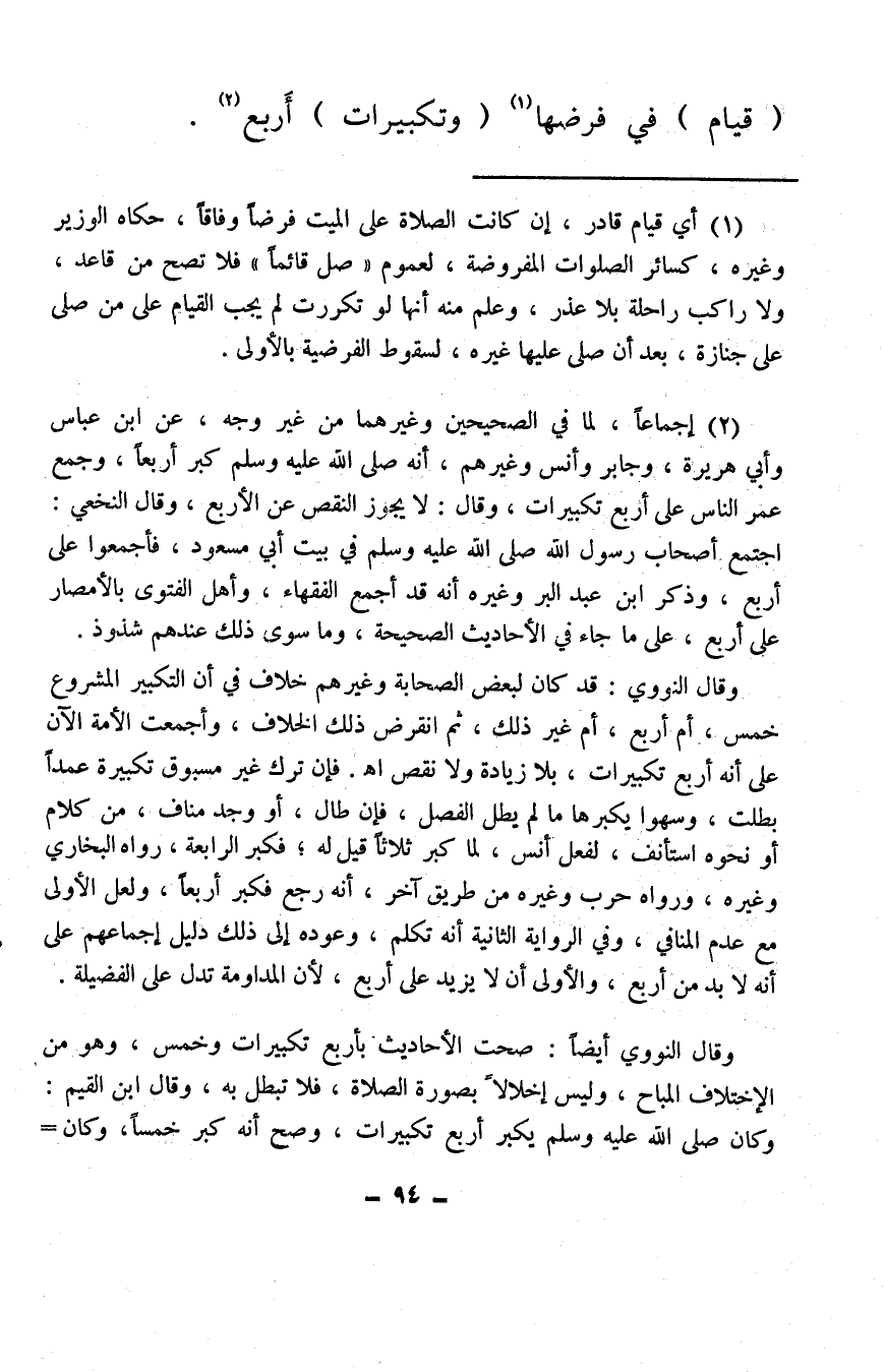 (¬2) أجماعًا، لما في الصحيحين وغيرهما من غير وجه، عن ابن عباس وأبي هريرة، وجابر وأنس وغيرهم، أنه صلى الله عليه وسلم كبر أربعًا، وجمع عمر الناس على أربع تكبيرات، وقال: لا يجوز النقص عن الأربع، وقال النخعي: اجتمع أصحاب رسول الله صلى الله عليه وسلم في بيت أبي مسعود، فأجمعوا على أربع، وذكر ابن عبد البر وغيره أنه قد أجمع الفقهاء، وأهل الفتوى بالأمصار على أربع، على ما جاء في الأحاديث الصحيحة، وما سوى ذلك عندهم شذوذ.