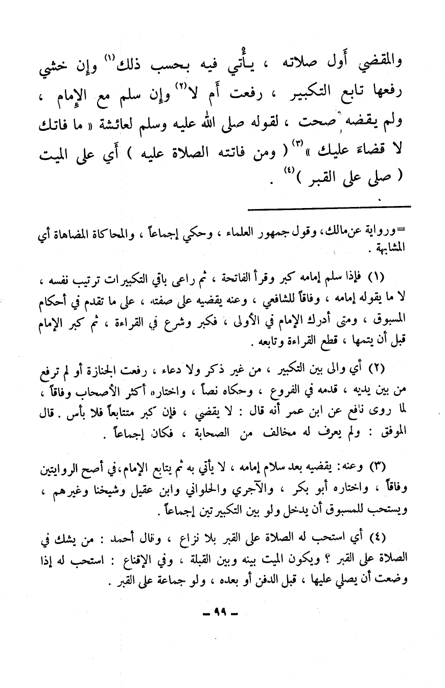 (¬1) فإذا سلم إمامه كبر وقرأ الفاتحة، ثم راعى باقي التكبيرات ترتيب نفسه، لا ما يقوله إمامه، وفاقًا للشافعي، وعنه يقضيه على صفته، على ما تقدم في أحكام المسبوق، ومتى أدرك الإمام في الأولى، فكبر وشرع في القراءة، ثم كبر الإمام قبل أن يتمها، قطع القراءة وتابعه.