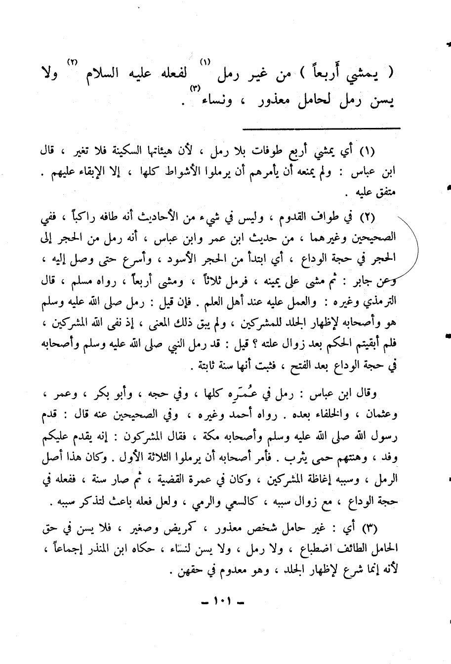 (¬1) أي يمشي أربع طوفات بلا رمل، لأن هيئاتها السكينة فلا تغير، قال ابن عباس: ولم يمنعه أن يأمرهم أن يرملوا الأشواط كلها، إلا الإبقاء عليهم متفق عليه.