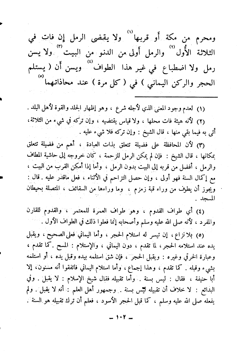 (¬3) لأن المحافظة على فضيلة تتعلق بذات العبادة، أهم من فضيلة تتعلق بمكانها، قال الشيخ: فإن لم يمكن الرمل للزحمة، كان خروجه إلى حاشية المطاف والرمل، أفضل من قربه إلى البيت بدون الرمل، وأما إذا أمكن القرب من البيت، مع إكمال السنة فهو أولى، وإن حصل التزاحم في الأثناء فعل ما قدر عليه قال: ويجوز أن يطوف من وراء قبة زمزم، وما وراءها من السقائف، المتصلة بحيطان المسجد.