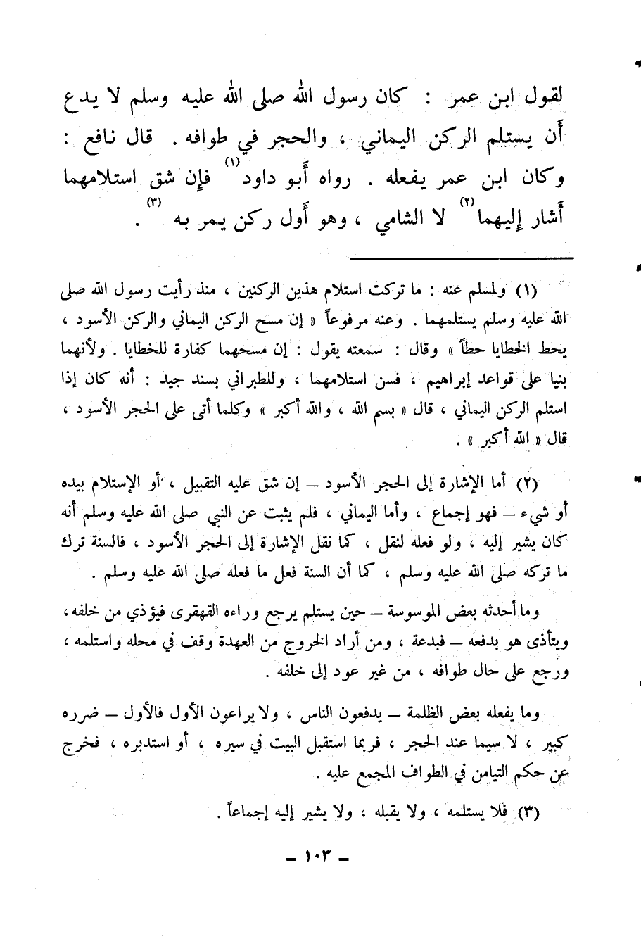 (¬2) أما الإشارة إلى الحجر الأسود إن شق عليه التقبيل، أو الاستلام بيده أو شيء فهو إجماع، وأما اليماني فلم يثبت عن النبي صلى الله عليه وسلم أنه كان يشير إليه، ولو فعله لنقل، كما نقل الإشارة إلى الحجر الأسود، فالسنة ترك ما تركه صلى الله عليه وسلم كما أن السنة فعل ما فعله صلى الله عليه وسلم.