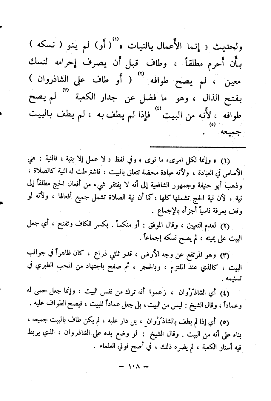 ولحديث: «إنما الأعمال بالنيات» (¬1) (أو) لم ينو (نسكه) أن أحرم مطلقا، وطاف قبل أن يصرف إحرامه لنسك معين، لم يصح طوافه (¬2) (أو طاف على الشاذروان) بفتح الذال، وهو ما فضل عن جدار الكعبة (¬3) لم يصح طوافه لأنه من البيت (¬4) فإذا لم يطف به، لم يطف بالبيت جميعه (¬5) .