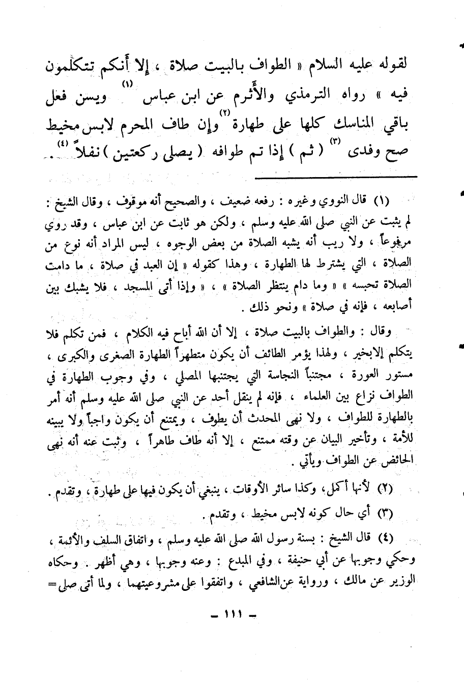 وقال: والطواف بالبيت صلاة، إلا أن الله أباح فيه الكلام، فمن تكلم فلا يتكلم إلا بخير، ولهذا يؤمر الطائف أن يكون متطهرا الطهارة الصغرى والكبرى، مستور العورة، مجتنبا النجاسة التي يجتنبها المصلي، وفي وجوب الطهارة في الطواف نزاع بين العلماء، فإنه لم ينقل أحد عن النبي صلى الله عليه وسلم أنه أمر بالطهارة للطواف، ولا نهى المحدث أن يطوف ويمتنع أن يكون واجبا ولا يبينه للأمة، وتأخير البيان عن وقته ممتنع، إلا أنه طاف طاهرا، وثبت عنه أنه نهى الحائض عن الطواف ويأتي.