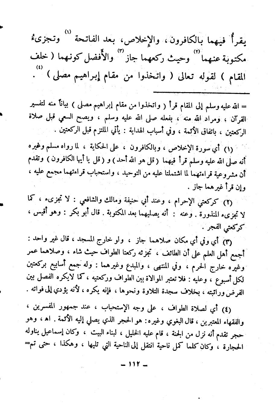 (¬4) أي لصلاة الطواف، على وجه الاستحباب، عند جمهور المفسرين والفقهاء المعتبرين قال البغوي وغيره: وهو الحجرالذي يصلي إليه الأئمة اهـ وهو حجر تقدم أنه نزل من الجنة، قام عليه الخليل، لبناء البيت، وكان إسماعيل يناوله الحجارة، وكان كلما كمل ناحية انتقل إلى الناحية التي تليها، وهكذا حتى تم جدار الكعبة، وأثر قدمي الخليل فيه، قال أنس: رأيت فيه أصابعه، وأخمص قدميه، غير أنه أذهبه مسح الناس بأيديهم، ثم صفح بالفضة، وكان في زمن النبي صلى الله عليه وسلم وأبي بكر ملتصقا بالبيت، يمنة الداخل، ثم أخره عمر وأقره المسلمون، وهو نحو شبر ونصف طولا وعرضا، وضع عليه قبة من خشب، ثم من حديد، وعليه قبة عالية من خشب، قائم على أربعة أعمدة دقيقة من حجارة، بينها شبابيك من حديد، نصبت في القرن التاسع، فيصلي خلفه، لفعله صلى الله عليه وسلم متفق عليه، وما حوله مما يطلق عليه اسم المقام عرفا، ثم ما قرب من البيت خصوصا ما قرب من الملتزم والباب، ثم الحجر ثم ما قرب من سائر جوانب البيت، ويجوز في غير ذلك، لأن عمر ركعهما بذي طوى، رواه البخاري، ولا يشرع تقبيله ولا مسحه إجماعًا، ولا سائر المقامات وتقدم.