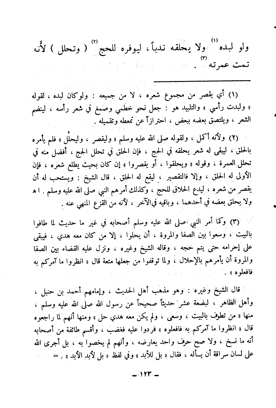 (¬3) وكما أمر النبي صلى الله عليه وسلم أصحابه في غير ما حديث لما طافوا بالبيت، وسعوا بين الصفا والمروة، أن يحلوا، إلا من كان معه هدي، فيبقى على إحرامه حتى يتم حجه، وقاله الشيخ وغيره: ونزل عليه القضاء بين الصفا والمروة أن يأمرهم بالإحلال، ولما توقفوا من جعلها متعة قال: انظروا ما أمركم به فافعلوه.