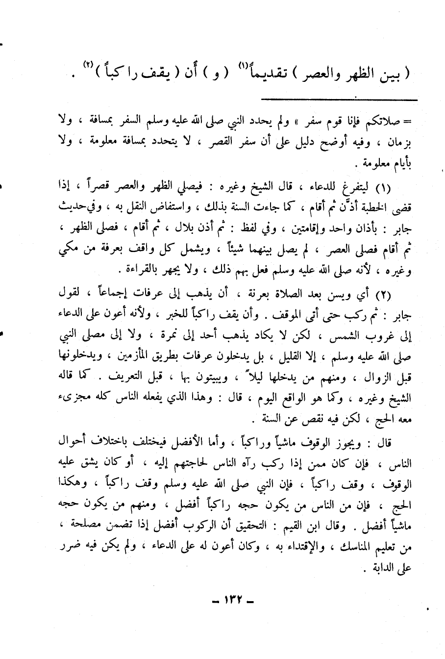 (¬1) ليتفرغ للدعاء، قال الشيخ وغيره: فيصلي الظهر والعصر قصرا، إذا قضى الخطبة أذن ثم أقام، كما جاءت السنة بذلك، واستفاض النقل به، وفي حديث جابر: بأذان واحد وإقامتين.