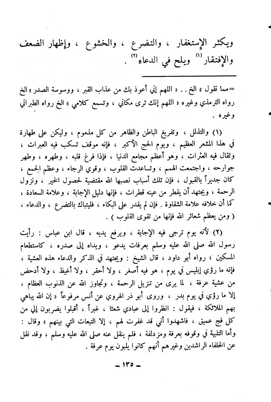 (¬1) والتذلل، وتفريغ الباطن والظاهر من كل مذموم، وليكن على طهارة في هذا المشعر العظيم، ويوم الحج الأكبر، فإنه موقف تسكب فيه العبرات، وتقال فيه العثرات، وهو أعظم مجامع الدنيا، فإذا فرغ قلبه، وطهره وطهر جوارحه، واجتمعت الهمم وتساعدت القلوب، وقوي الرجاء، وعظم الجمع كان جديرا بالقبول، فإن تلك أسباب نصبها الله مقتضية لحصول الخير، ونزول الرحمة ويجتهد أن يقطر من عينه قطرات، فإنها دليل الإجابة، وعلامة السعادة كما أن خلافه علامة الشقاوة، فإن لم يقدر على البكاء، فليتباك بالتضرع، والدعاء {وَمَنْ يُعَظِّمْ شَعَائِرَ اللهِ فَإِنَّهَا مِنْ تَقْوَى الْقُلُوبِ *} .