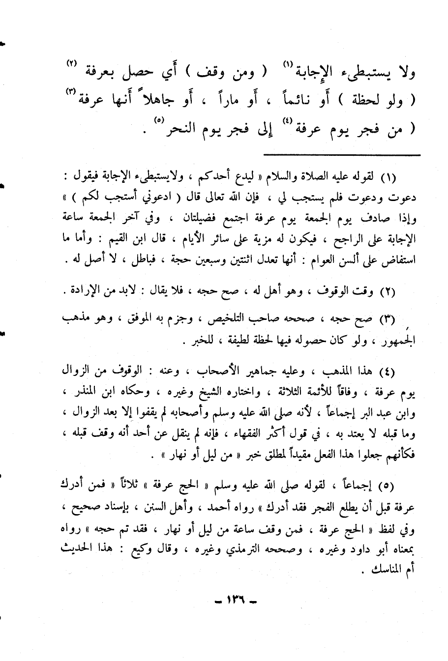 (¬5) إجماعا لقوله صلى الله عليه وسلم «الحج عرفة» ثلاثا «فمن أدرك عرفة قبل أن يطلع الفجر فقد أدرك» رواه أحمد، وأهل السنن، بإسناد صحيح، وفي لفظ «الحج عرفة، فمن وقف ساعة من ليل أو نهار، فقد تم حجه» رواه بمعناه أبو داود وغيره، وصححه الترمذي وغيره، وقال وكيع: هذا الحديث أم المناسك.