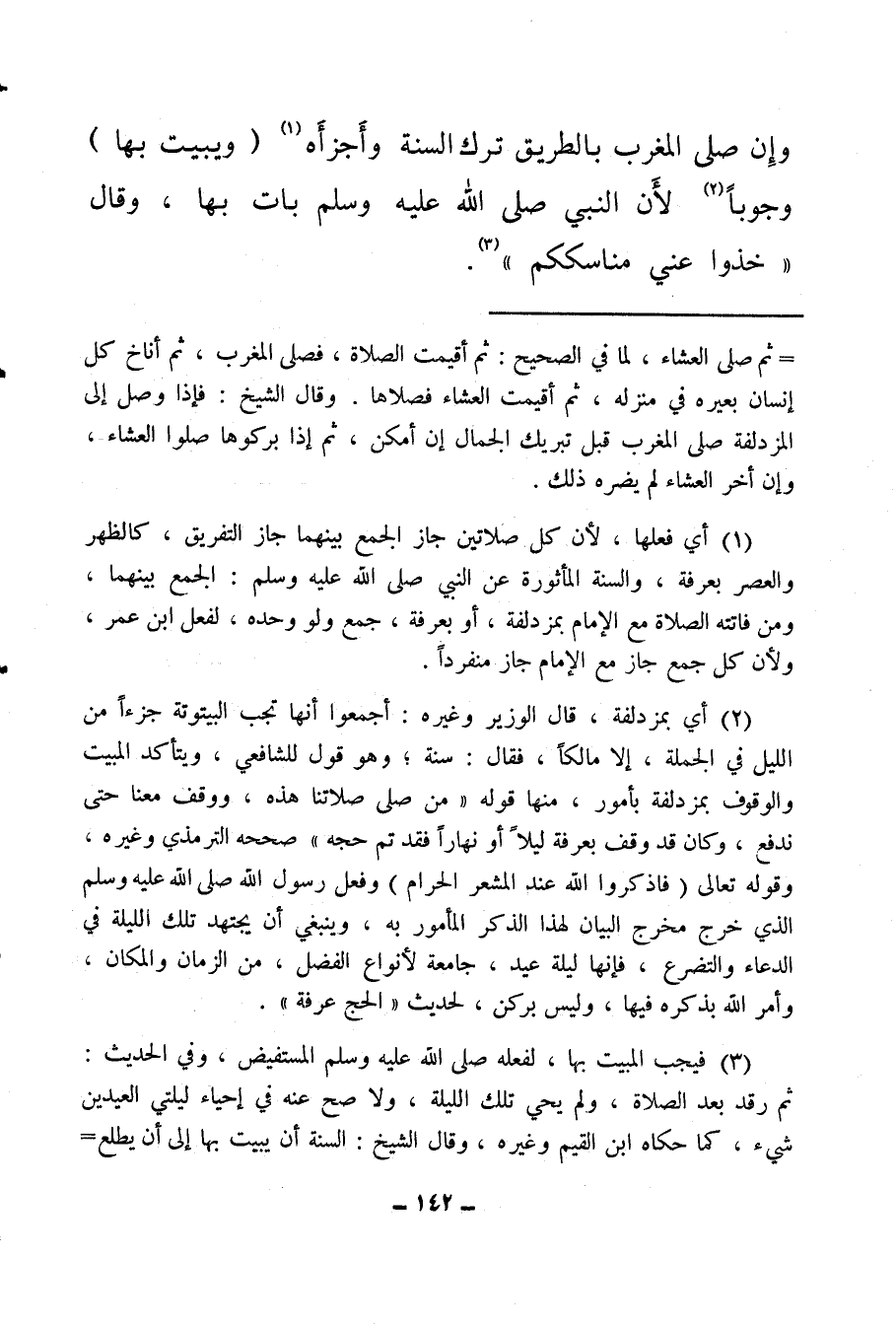 (¬3) فيجب المبيت بها، لفعله صلى الله عليه وسلم المستفيض، وفي الحديث: ثم رقد بعد الصلاة، ولم يحي تلك الليلة، ولا صح عنه في إحياء ليلتي العيدين شيء، كما حكاه ابن القيم وغيره، وقال الشيخ: السنة أن يبيت بها إلى أن يطلع
