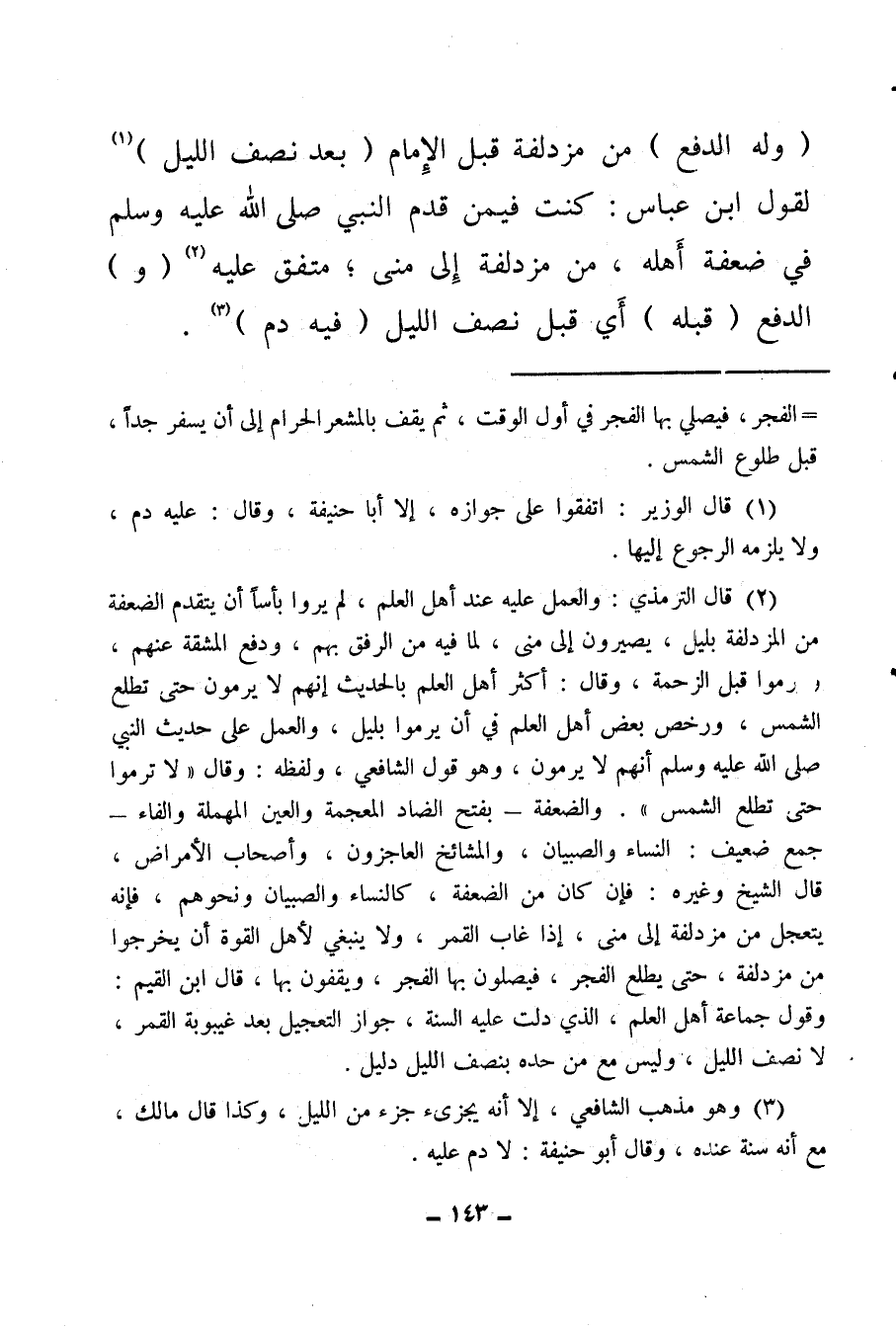 (¬2) قال الترمذي: والعمل عليه عند أهل العلم، لم يروا بأسا أن يتقدم الضعفة من المزدلفة بليل، يصيرون إلى منى، لما فيه من الرفق بهم، ودفع المشقة عنهم، رموا قبل الزحمة، وقال: أكثر أهل العلم بالحديث إنهم لا يرمون حتى تطلع الشمس، ورخص بعض أهل العلم في أن يرموا بليل، والعمل على حديث النبي صلى الله عليه وسلم أنهم لا يرمون، وهو قول الشافعي، ولفظه: وقال: «لا ترموا حتى تطلع الشمس» والضعفة بفتح الضاد المعجمة والعين المهملة والفاء جمع ضعيف: النساء والصبيان، والمشايخ العاجزون، وأصحاب الأمراض، قال الشيخ وغيره: فإن كان من الضعفة، كالنساء والصبيان ونحوهم، فإنه يتعجل من مزدلفة إلى منى، إذا غاب القمر، ولا ينبغي لأهل القوة أن يخرجوا من مزدلفة حتى يطلع الفجر فيصلون بها الفجر، ويقفون بها، قال ابن القيم: وقول جماعة أهل العلم، الذي دلت عليه السنة، جواز التعجيل بعد غيبوبة القمر، لا نصف الليل، وليس مع من حده بنصف الليل دليل.