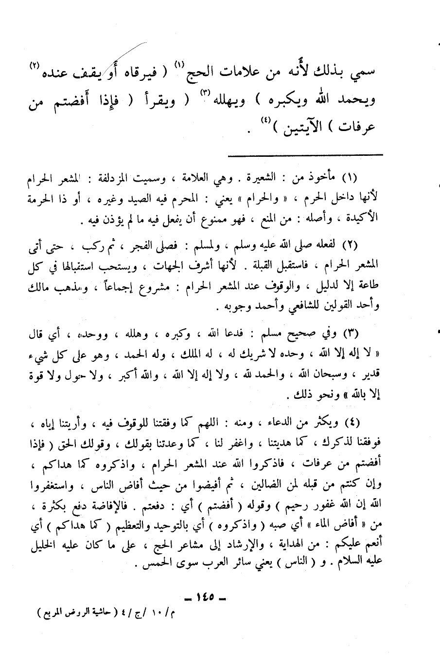 (¬4) ويكثر من الدعاء، ومنه: اللهم كما وفقتنا للوقوف فيه، وأريتنا إياه، فوفقنا لذكرك، كما هديتنا، واغفر لنا، كما وعدتنا بقولك، وقولك الحق {فَإِذَا أَفَضْتُمْ مِنْ عَرَفَاتٍ فَاذْكُرُوا اللهَ عِنْدَ الْمَشْعَرِ الْحَرَامِ وَاذْكُرُوهُ كَمَا هَدَاكُمْ وَإِنْ كُنْتُمْ مِنْ قَبْلِهِ لَمِنَ الضَّالِّينَ * ثُمَّ أَفِيضُوا مِنْ حَيْثُ أَفَاضَ النَّاسُ وَاسْتَغْفِرُوا اللهَ إِنَّ اللهَ غَفُورٌ رَحِيمٌ *} وقوله: {أَفَضْتُمْ} أي: دفعتم، فالإفاضة دفع بكثرة، من «أفاض الماء» أي صبه (واذكروه) أي بالتوحيد والتعظيم (كَمَا هَدَاكُمْ) أي أنعم عليكم: من الهداية، والإرشاد إلى مشاعر الحج، على ما كان عليه الخليل عليه السلام، و {النَّاسُ} يعني سائر العرب سوى الحمس.