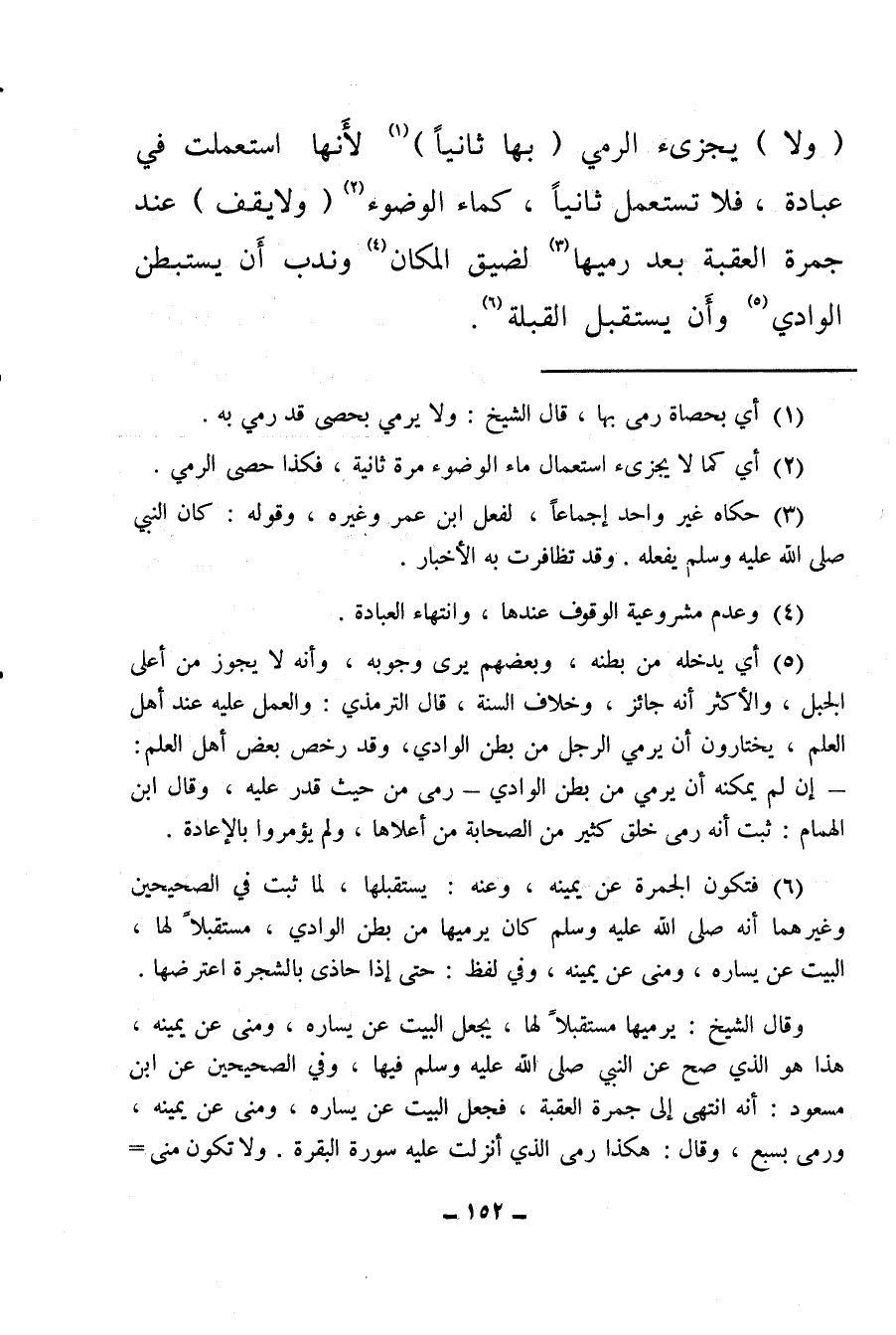 (ولا) يجزئ الرمي (بها ثانيا) (¬1) لأنها استعملت في عبادة، فلا تستعمل ثانيا، كماء الوضوء (¬2) (ولا يقف) عند جمرة العقبة بعد رميها (¬3) لضيق المكان (¬4) وندب أن يستبطن الوادي (¬5) وأن يستقبل القبلة (¬6) .
