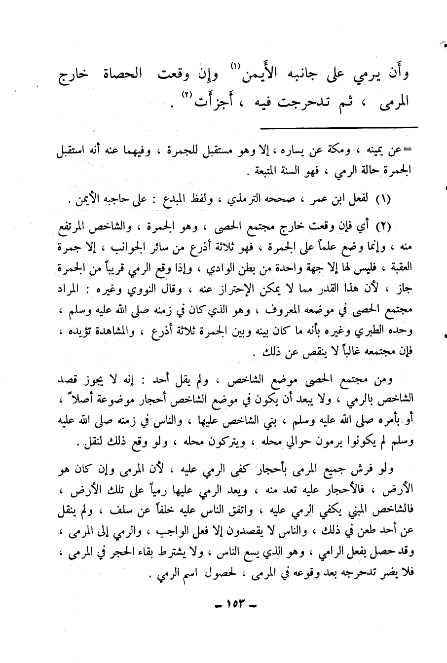 ومن مجتمع الحصى موضع الشاخص، ولم يقل أحد: إنه لا يجوز قصد الشاخص بالرمي، ولا يبعد أن يكون في موضع الشاخص أحجار موضوعة أصلا، أو بأمره صلى الله عليه وسلم، بني الشاخص عليها، والناس في زمنه صلى الله عليه وسلم لم يكونوا يرمون حوالي محله، ويتركون محله، ولو وقع ذلك لنقل.