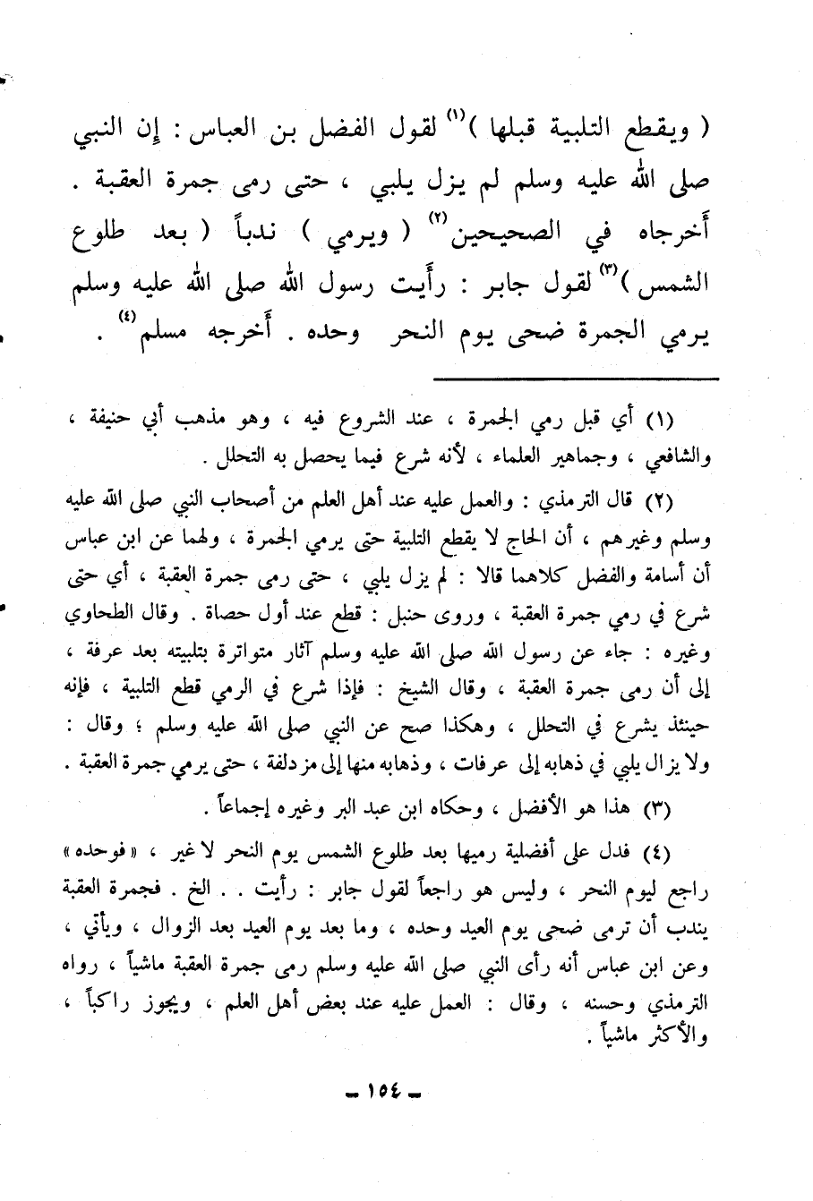 (¬2) قال الترمذي: والعمل عليه عند أهل العلم من أصحاب النبي صلى الله عليه وسلم وغيرهم، أن الحاج لا يقطع التلبية حتى يرمى الجمرة، ولهما عن ابن عباس أن أسامة والفضل كلاهما قالا: لم يزل يلبي حتى رمي جمرة العقبة، أي حتى شرع في رمي جمرة العقبة، وروى حنبل: قطع عند أول حصاة، وقال الطحاوي وغيره: جاء عن رسول الله صلى الله عليه وسلم آثار متواترة بتلبيته بعد عرفة، إلى أن رمى جمرة العقبة، وقال الشيخ: فإذا شرع في الرمي قطع التلبية، فإنه حينئذ يشرع في التحلل، وهكذا صح عن النبي صلى الله عليه وسلم وقال: ولا يزال يلبي في ذهابه إلى عرفات، وذهابه منها إلى مزدلفة حتى يرمي جمرة العقبة.