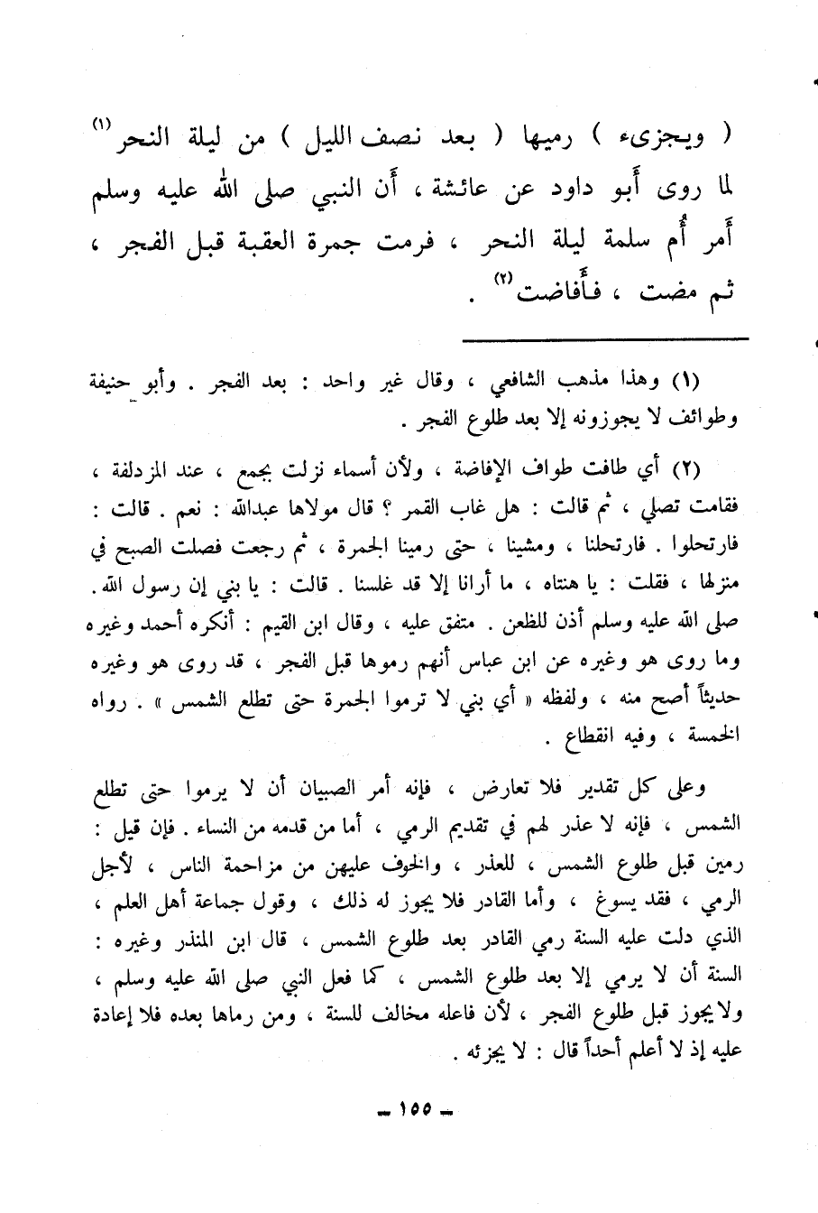 (¬2) أي طافت طواف الإفاضة، ولأن أسماء نزلت بجمع، عند المزدلفة فقامت تصلي، ثم قالت: هل غاب القمر؟ قال مولاها عبد الله: نعم قالت: فارتحلوا فارتحلنا، ومشينا، حتى رمينا الجمرة، ثم رجعت فصلت الصبح في منزلها فقلت: يا هنتاه، ما أرانا إلا قد غلسنا، قالت: يا بني إن رسول الله صلى الله عليه وسلم أذن للظعن متفق عليه، وقال ابن القيم: أنكره أحمد وغيره، وما روى هو وغيره عن ابن عباس أنهم رموها قبل الفجر، قد روى هو وغيره حديثا أصح منه، ولفظه «أي بني لا ترموا الجمرة حتى تطلع الشمس» رواه الخمسة وفيه انقطاع.