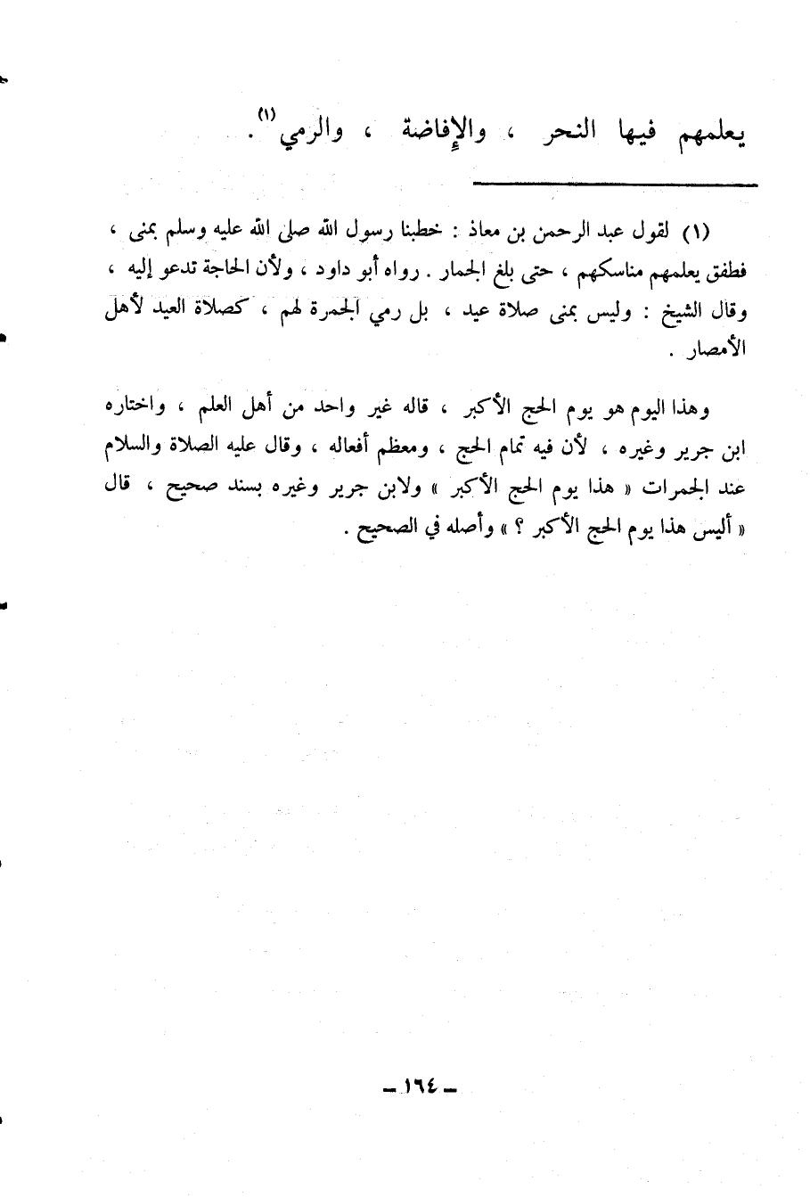 (¬1) لقول عبد الرحمن بن معاذ: خطبنا رسول الله صلى الله عليه وسلم بمنى، فطفق يعلمهم مناسكهم، حتى بلغ الجمار، رواه أبو داود، ولأن الحاجة تدعو إليه وقال الشيخ: وليس بمنى صلاة عيد، بل رمي الجمرة لهم، صلاة العيد لأهل الأمصار.