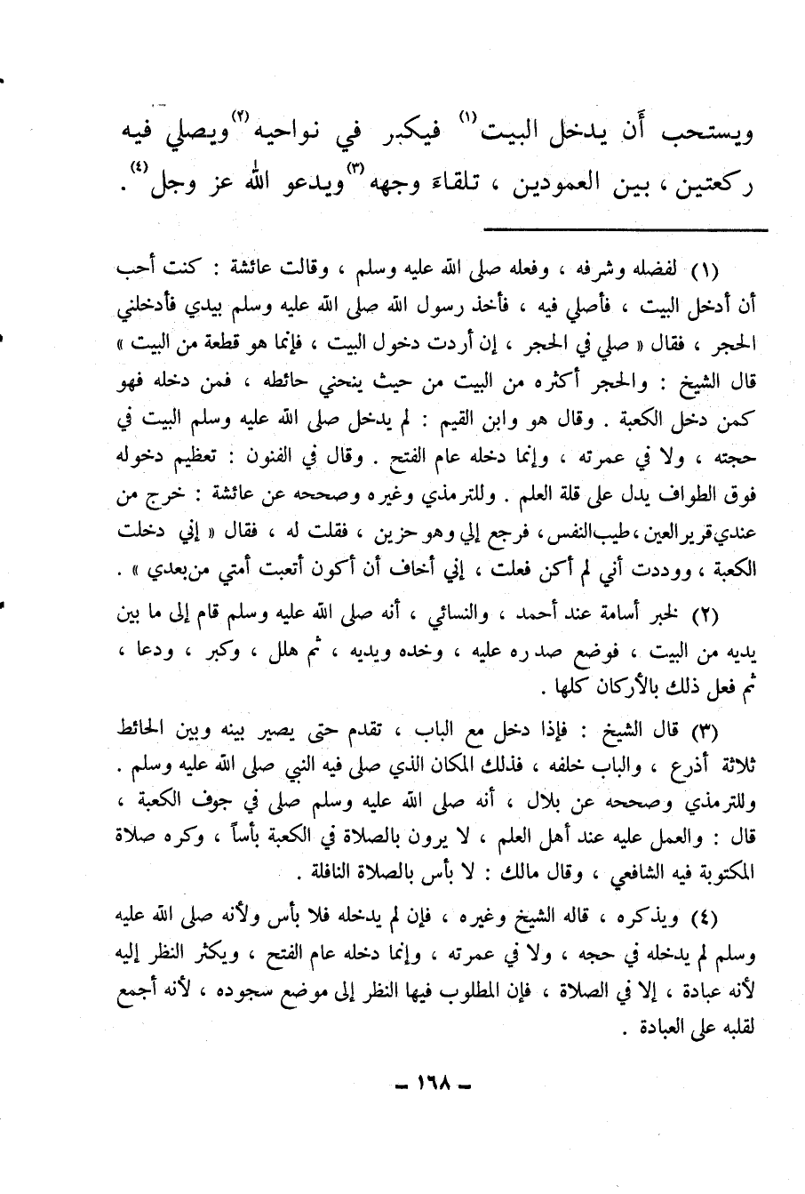 (¬3) قال الشيخ: فإذا دخل مع الباب، تقدم حتى يصير بينه وبين الحائط ثلاثة أذرع، والباب خلفه، فذلك المكان الذي صلى فيه النبي صلى الله عليه وسلم وللترمذي وصححه عن بلال، أنه صلى الله عليه وسلم صلى في جوف الكعبة، قال: والعمل عليه عند أهل العلم، لا يرون بالصلاة في الكعبة بأسًا، وكره صلاة المكتوبة فيه الشافعي، وقال مالك: لا بأس بالصلاة النافلة.