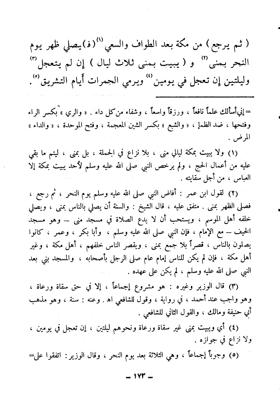 (¬1) ولا يبيت بمكة ليالي منى، بلا نزاع في الجملة، بل بمنى، ليتم ما بقي عليه من أعمال الحج، ولم يرخص النبي صلى الله عليه وسلم لأحد يبيت بمكة إلا العباس، من أجل سقايته.