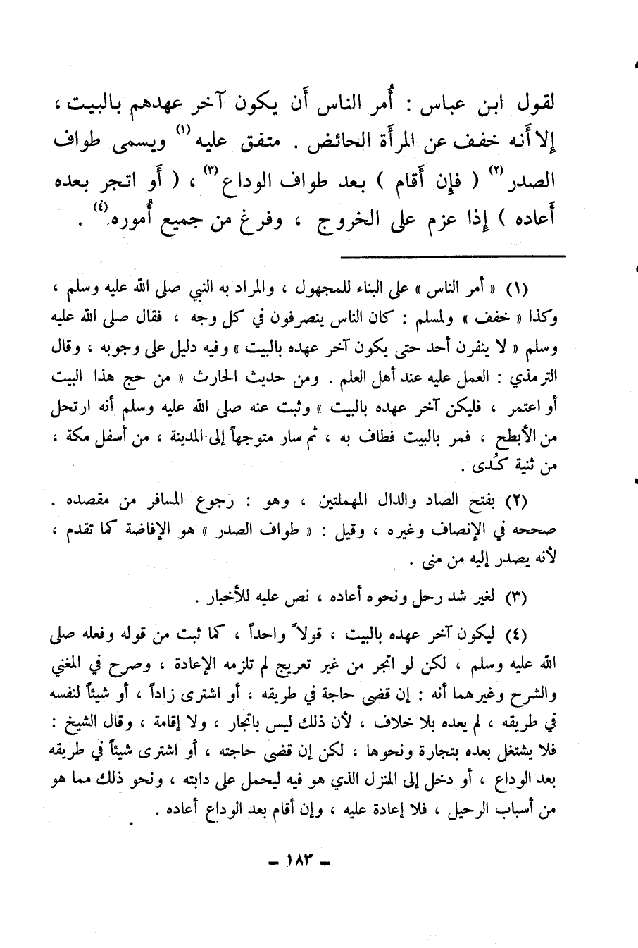 (¬4) ليكون آخر عهده بالبيت قولاً واحدًا، كما ثبت من قوله وفعله صلى الله عليه وسلم لكن لو اتجر من غير تعريج لم تلزمه الإعادة، وصرح في المغني والشرح وغيرهما أنه: إن قضى حاجة في طريقه، أو اشترى زادًا، أو شيئًا لنفسه في طريقه، لم يعده بلا خلاف، لأن ذلك ليس باتجار، ولا إقامة وقال الشيخ فلا يشتغل بعده بتجارة ونحوها، ولكن إن قضى حاجته أو اشترى شيئا في طريقه بعد الوداع، أو دخل إلى المنزل الذي هو فيه ليحمل على دابته، ونحو ذلك مما هو من أسباب الرحيل، فلا إعادة عليه، وإن أقام بعد الوداع أعاده.