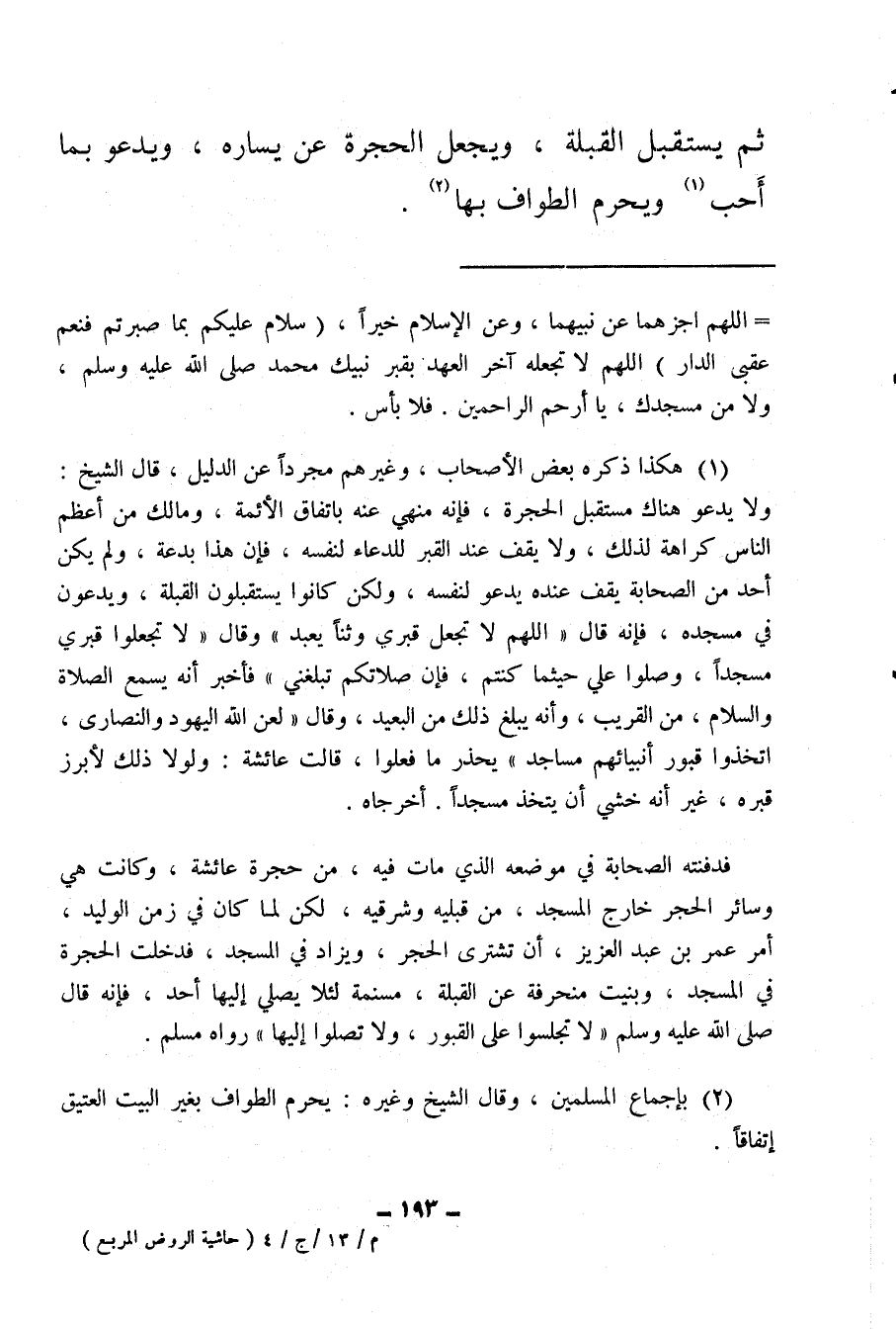 (¬1) هكذا ذكره بعض الأصحاب، وغيرهم مجردًا عن الدليل، قال الشيخ: ولا يدعو هناك مستقبل الحجرة، فإنه منهي عنه باتفاق الأئمة، ومالك من أعظم الناس كراهة لذلك، ولا يقف عند القبر للدعاء لنفسه، فإن هذا بدعة، ولم يكن أحد من الصحابة يقف عنده يدعو لنفسه، ولكن كانوا يستقبلون القبلة، ويدعون في مسجده، فإنه قال: «اللهم لا تجعل قبري وثنا يعبد» وقال «لا تجعلوا قبري مسجدًا وصلوا علي حيثما كنتم، فإن صلاتكم تبلغني» فأخبر أنه يسمع الصلاة والسلام من القريب، وأنه يبلغ ذلك من البعيد، وقال «لعن الله اليهود والنصارى، اتخذوا قبور أنبيائهم مساجد» يحذر ما فعلوا، قالت عائشة: ولولا ذلك لأبرز قبره، غير أنه خشي أن يتخذ مسجدًا، أخرجاه.